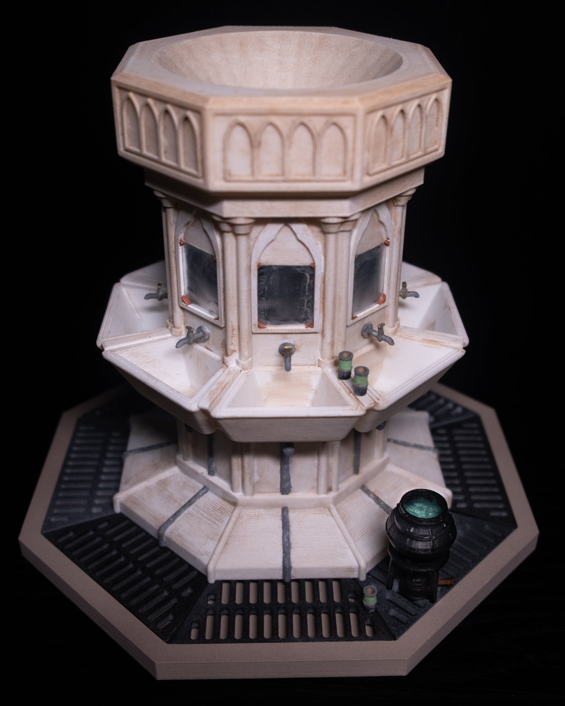 Entièrement modélisée en 3D, imprimée en PLA, puis peinte et assemblée à la main, cette création reproduit avec fidélité l’architecture gothique des lavabos et l’atmosphère énigmatique de la plus célèbre école de sorciers.