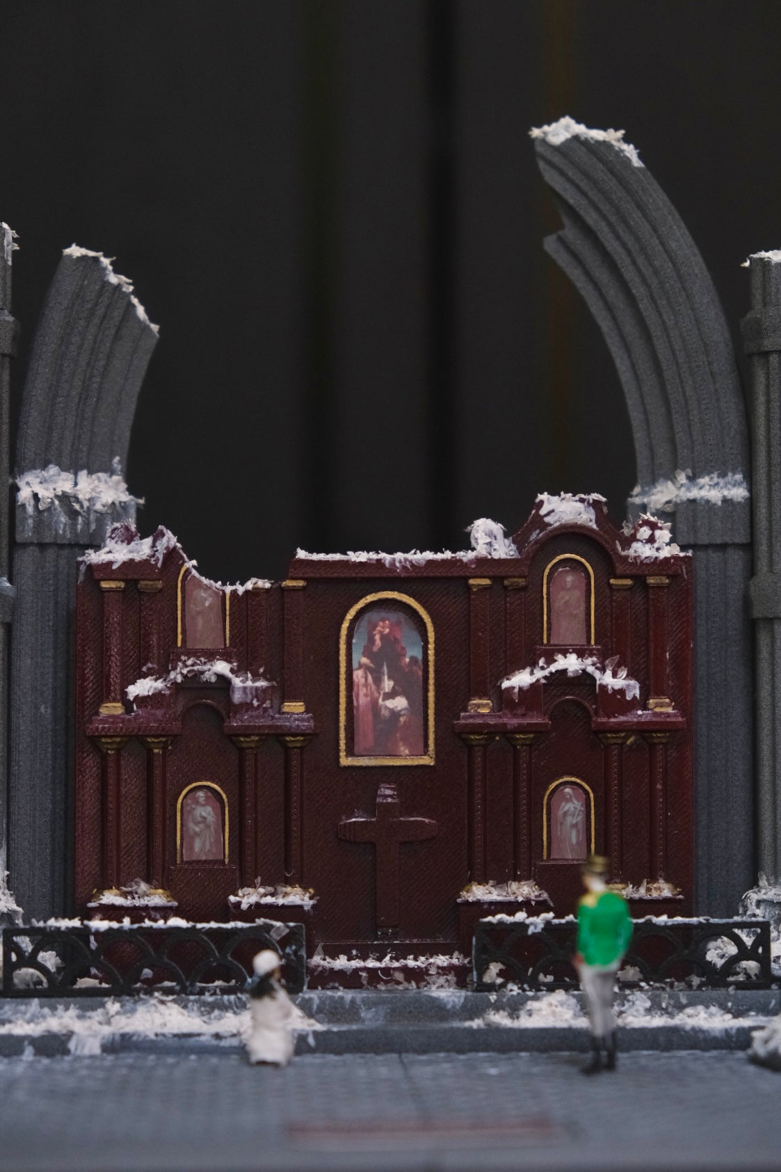 Entièrement modélisée en 3D, imprimée en PLA, puis peinte et assemblée à la main, elle capture avec justesse la beauté fragile d’une église en ruine et la tendresse d’une rencontre au cœur du chaos.